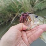 バスの体色は黒く、釣り上げたあと体が曲がっているのが印象的。