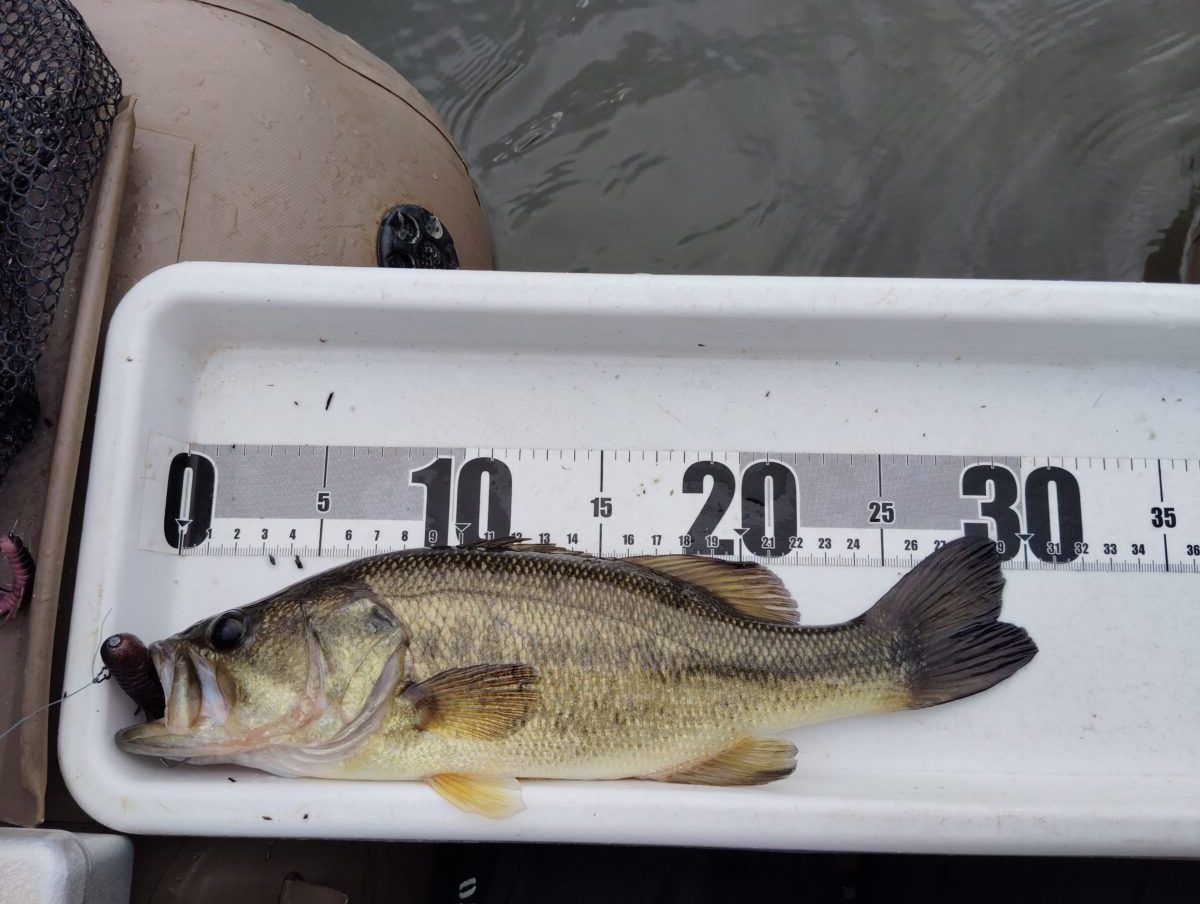 バスの体色は黒く、釣り上げたあと体が曲がっているのが印象的。