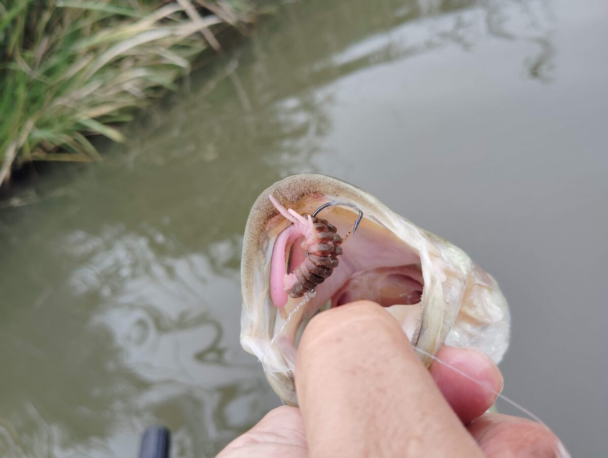 重めのシンカーでボトムを取り、ラインをピンと張ってバイトを待つ。じっくり誘うこの釣り方は、活性が下がったバスにも効果抜群です。