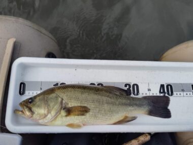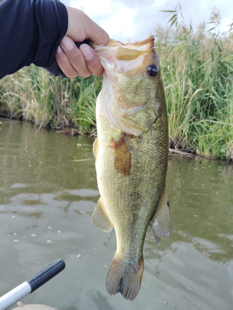 翌日のガイドに備えて、ちょっとだけフローターを出してみた10月4日。釣行時間はわずか2時間だったんですが、開始早々に41㎝のナイスバスをキャッチ!この日は水位が高く、釣りやすい状況だったのがラッキーでした。