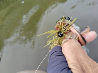 ガード付きジグヘッドにラバーがついたシンプルな作りで、正直見た目は地味。しかし霞ヶ浦では以前から「なぜかよく釣れる」私のお気に入りルアーです。