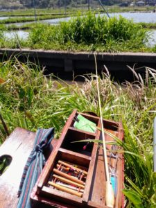 リペアした水箱とこの竹竿を使いだしてから、この道具にひきつけられて声を掛けられることが多くなりまして、この時期なのでできればそっとしておいてほしいのですが、無視するわけにもいかないので、ソーシャルディスタンスを意識しながらお話をします。