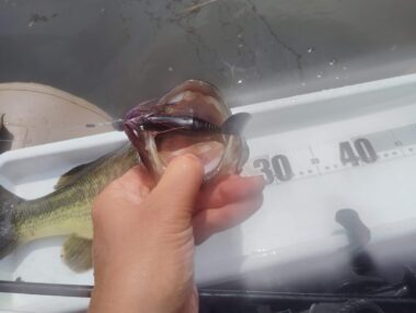 4/17ギャップジグ5gにレックスグラブ5インチをセットして、ゴミの下に落として軽くアクションを入れた瞬間にバイトがあり、そのままスーッと持っていかれて上がってきたのが41cm、1140gのプリスポーンのバスでした。